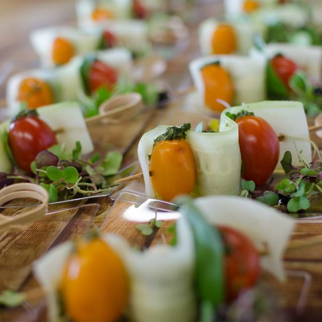 Enfilat de tomàquets cirerols, mozzarella, alfàbrega i cogombre