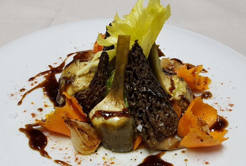 Amanida de carxofes, múrgoles fresques,api, encenalls de pastanaga, cebetes rostides i reducció de fons de bou