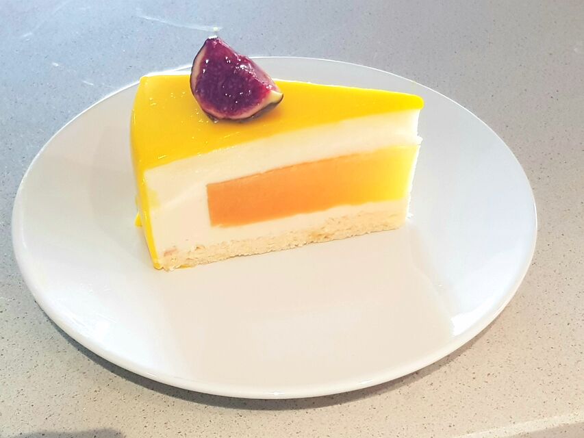 Mousse glacejat mirall de mango amb gelea de gerds