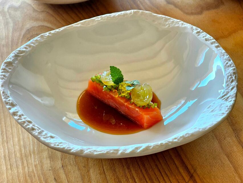 Lingot de salmó fumat premium amb suc del rostit de l'escalivada, pebrot verd picat, raïm pelat, perles d'oli verge i herbes aromàtiques